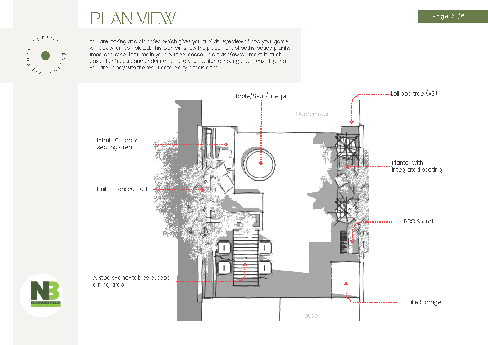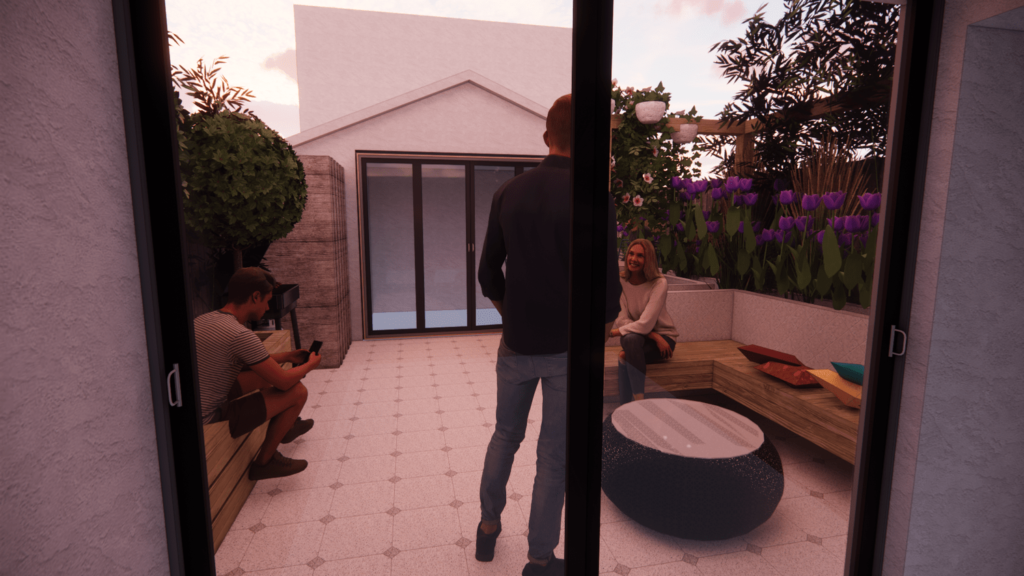 Above, a modern pergola structure could provide partial shade, ideal for the client’s desire to work outside in favourable weather conditions.