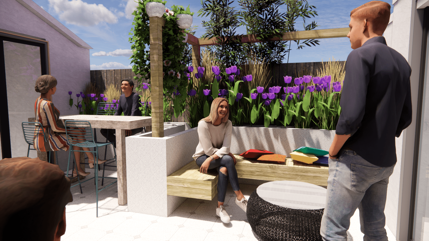 The positioning of the seating area maximises the use of space and allows for easy movement around the garden. It could serve well for the small BBQs and gatherings the client intends to host.