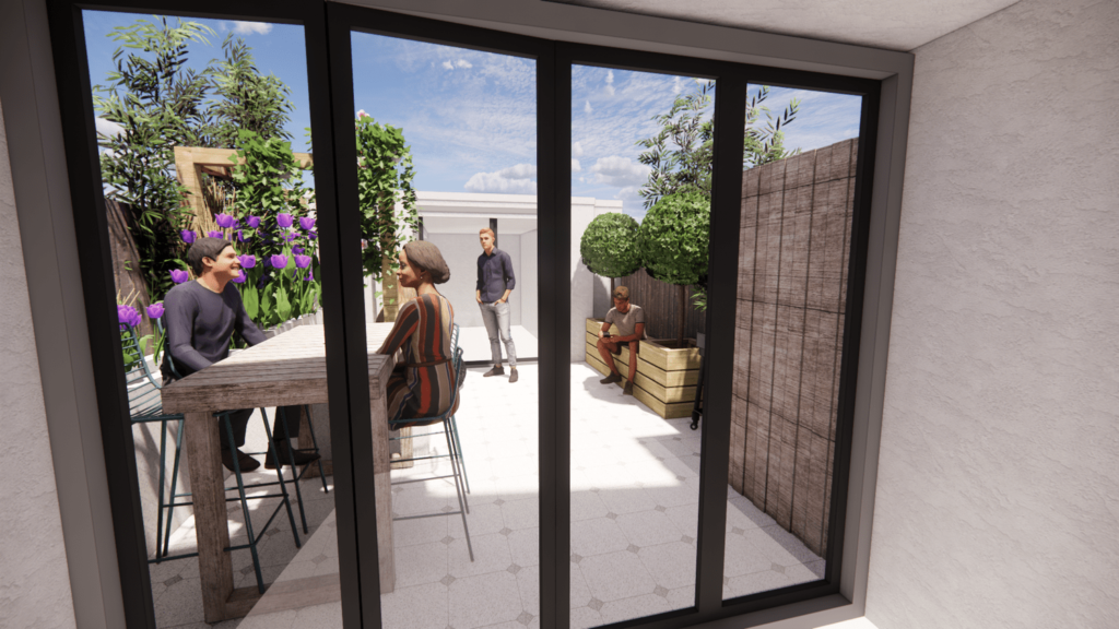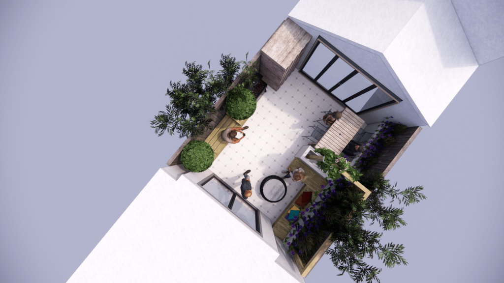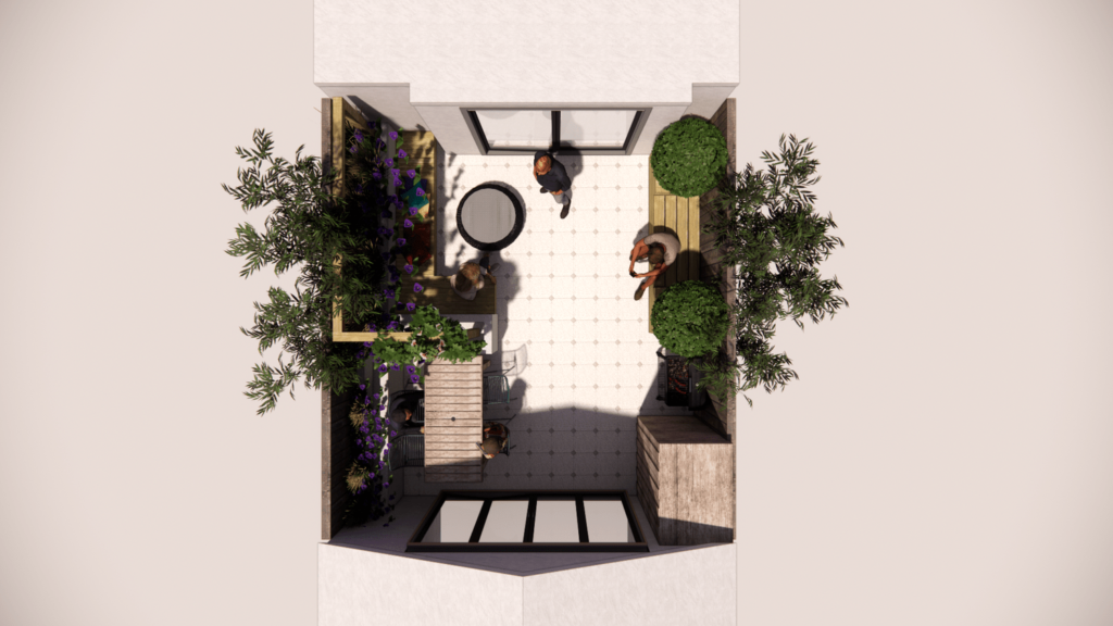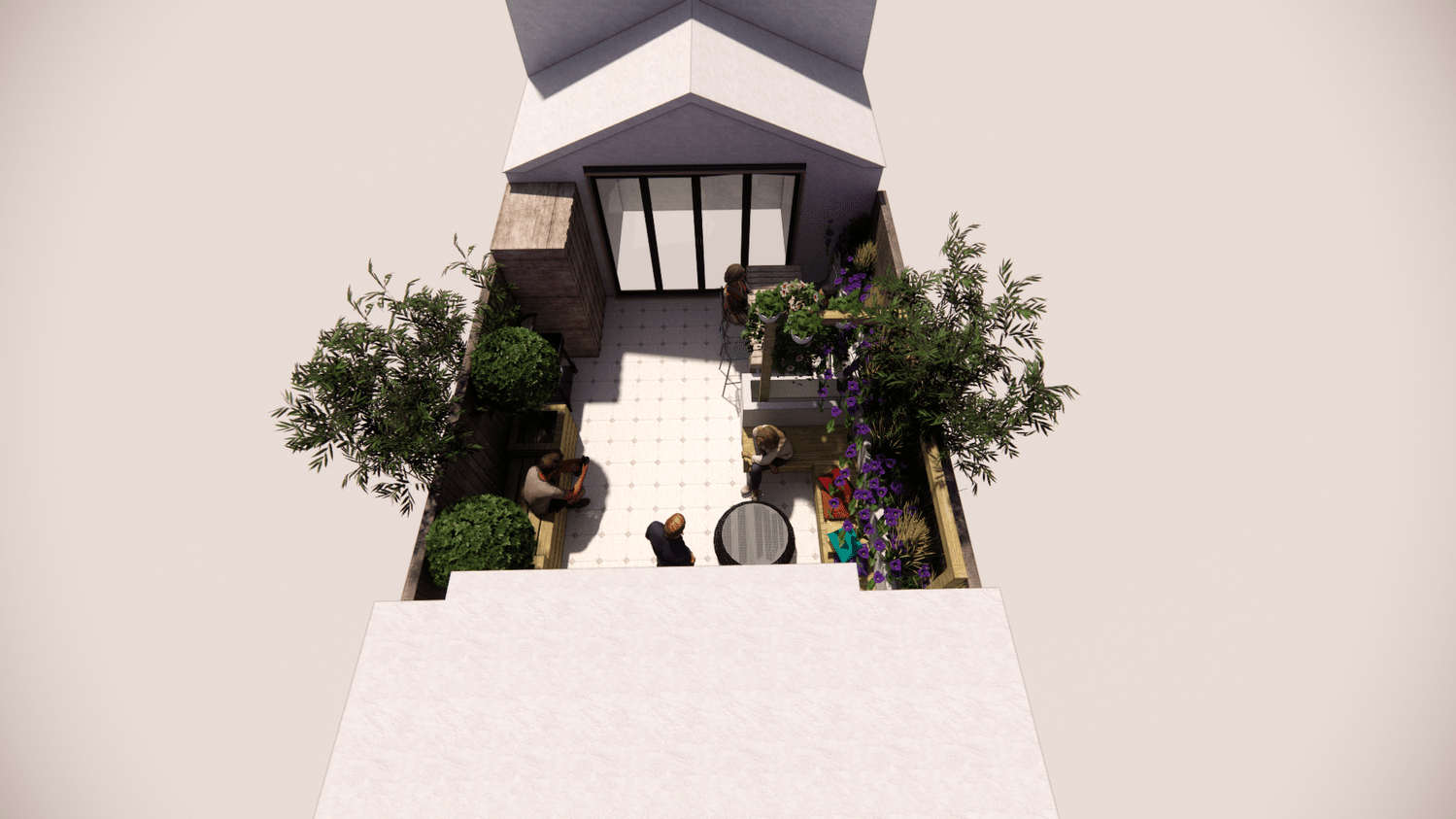 The client wanted to transform their 4.9m x 4.4m Greenwich garden into a lush, social space with cohesive tiling, incorporating plantings and a potted tree while considering bike storage and maintaining access to a drain. We put together a compact urban garden space that is both modern and functional. This garden is designed with an emphasis on social interaction and relaxation.