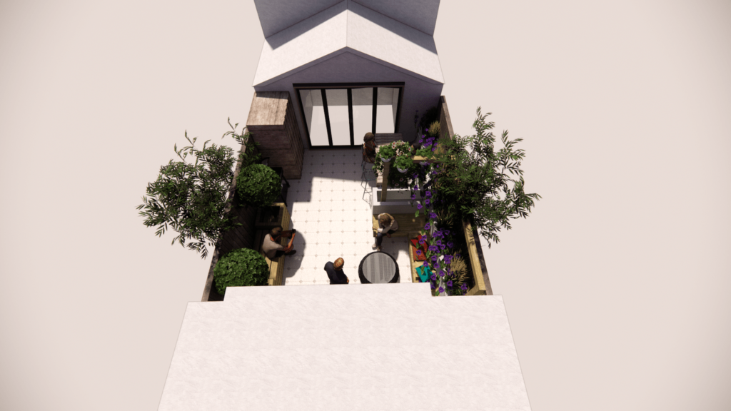 We designed borders along the walls, providing a sense of privacy. On the left, a vertical garden with cascading purple flowers adds a pop of colour and a touch of nature’s softness against the urban backdrop.